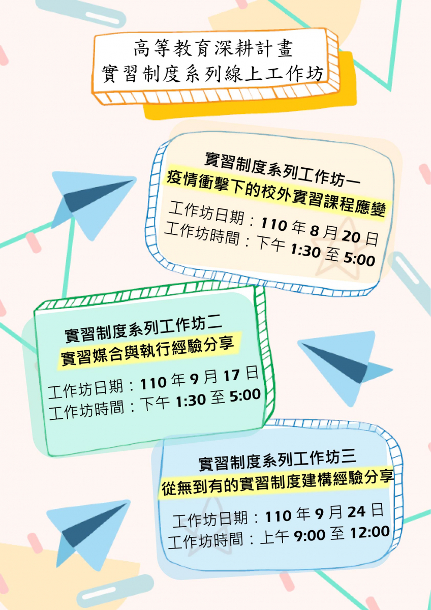 國立臺灣大學執行教育部委辦計畫「107-111年度高教深耕計畫推動協調與影響評估計畫」,於110年7月至9月辦理3場實習制度系列工作坊(活動議程如附件),歡迎本校教職員踴躍報名參加。