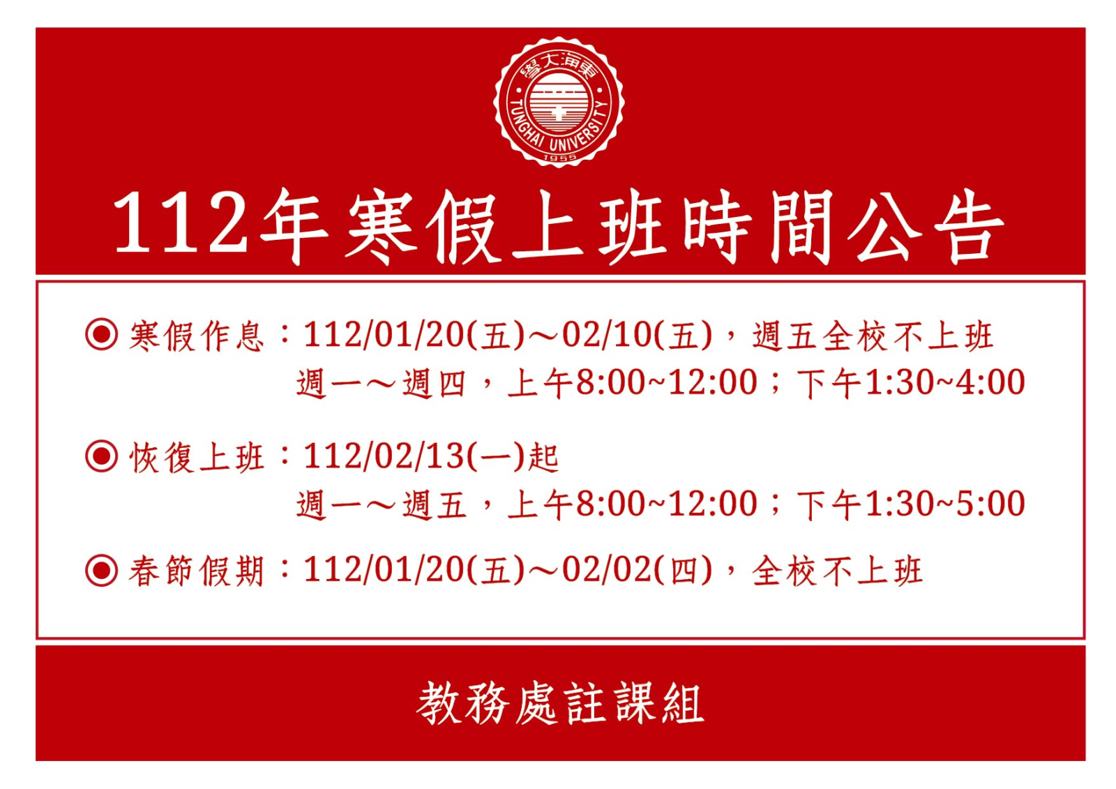 1、如有學籍、課程及成績等問題請於上班時間洽詢本組,總機(04)2359-0121,學籍及成績分機#22101~22109;課程分機#22111~22115。