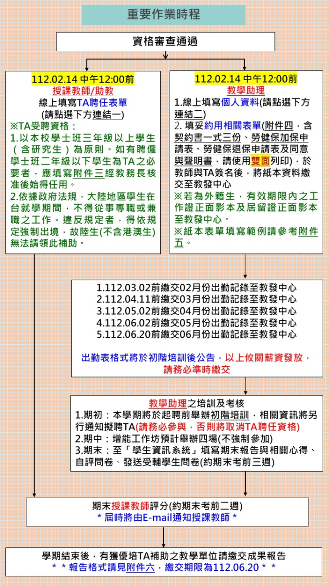 ※注意:勞僱型TA每月須扣繳個人保費本國籍生266元整/外籍生244元整,繳納至勞保局辦理加保;若未按時繳交同意與聲明書、契約書、勞保加、退保申請表及僅外籍生需繳交有效期限內之工作證正面影本、居留證正面影本,延遲後續行政作業,將延誤起聘時間,則助學金將依實際聘期,予以調降。若未按時繳交出勤記錄表,則將延誤薪資核撥時間。