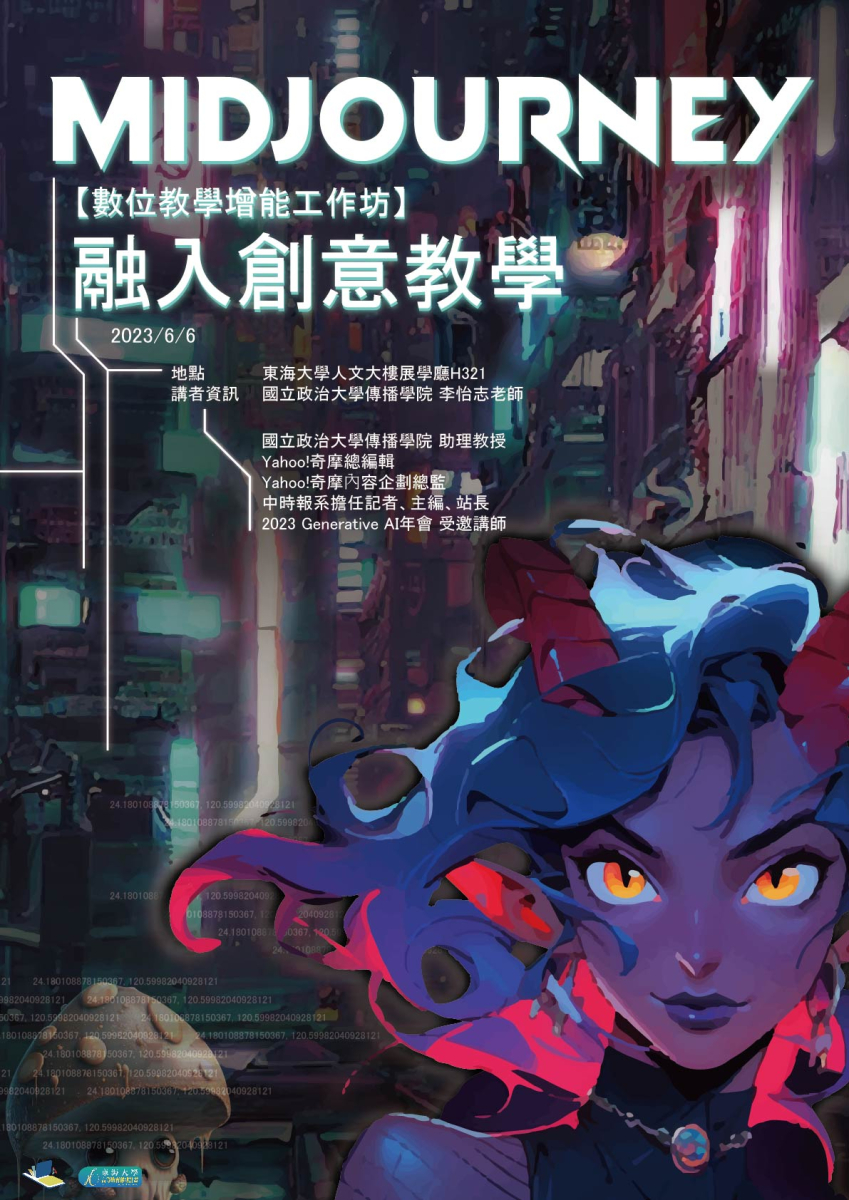 講座將邀請2023 Generative AI年會 受邀講師 李怡志老師介紹Midjourney 的功能和特色,並且示範如何用它來融入創意教學,Midjourney 不僅可以增加你和學生的學習動機和興趣,也可以開拓師生的思維和想像力,讓教學和學習變得更有趣和有效。