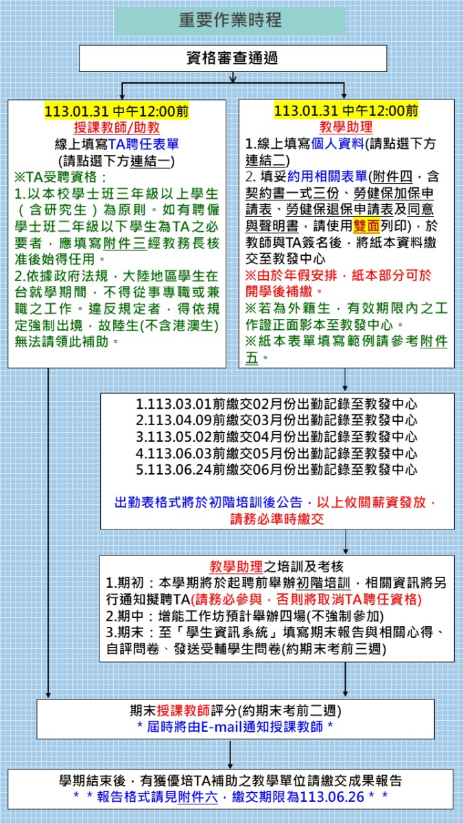 ※注意:勞僱型TA每月須扣繳個人保費本國籍生266元整/外籍生244元整,繳納至勞保局辦理加保;若未按時繳交同意與聲明書、契約書、勞保加、退保申請表及僅外籍生需繳交有效期限內之工作證正面影本,延遲後續行政作業,將延誤起聘時間,則助學金將依實際聘期,予以調降。若未按時繳交出勤記錄表,則將延誤薪資核撥時間。