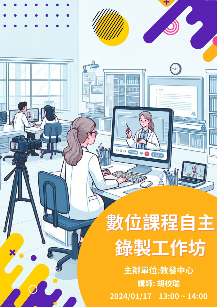 本工作坊以Microsoft office PowerPoint為課程錄製軟體,並提供安裝視訊攝影機及使用PPT進行簡易的後製教學,協助教師改善自主錄製的畫面及收音品質,歡迎全校對數位課程自主錄製有興趣的教職員踴躍報名參加