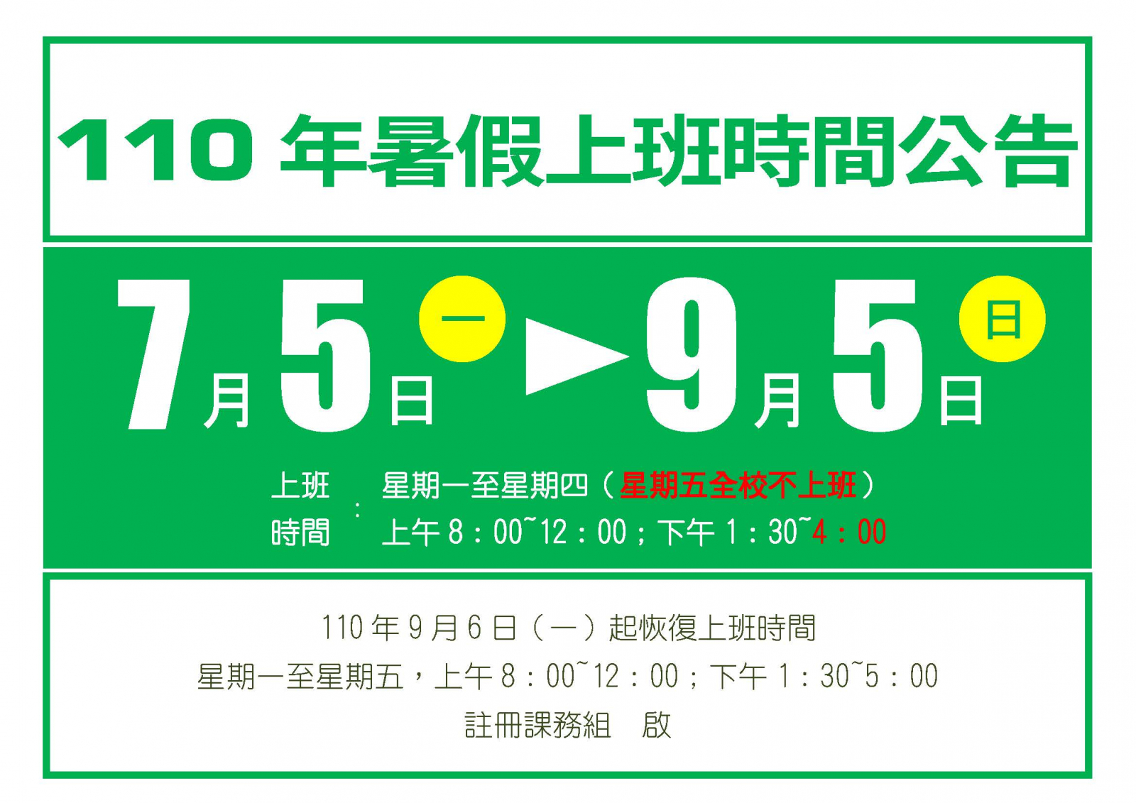 【註冊-學籍公告】110年暑假上班時間公告