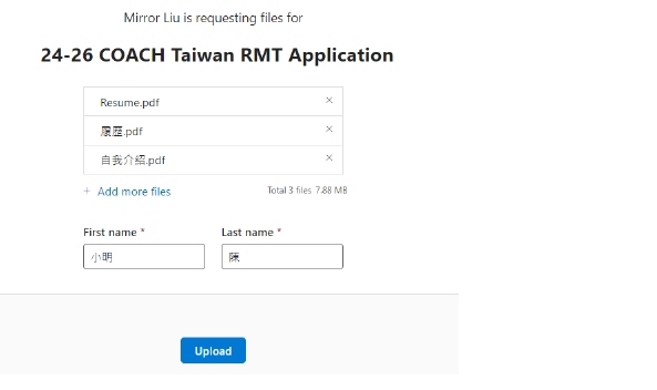 請特別注意資料上傳規則: 檔名請起 自我介紹 / 履歷 / Resume,First Name 填寫中文名,Last Name 填寫中文姓,收件期間為即日起至 2024/04/24 止。