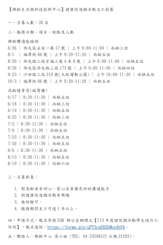 【樂齡生活與科技創新中心】健康促進類活動志工招募