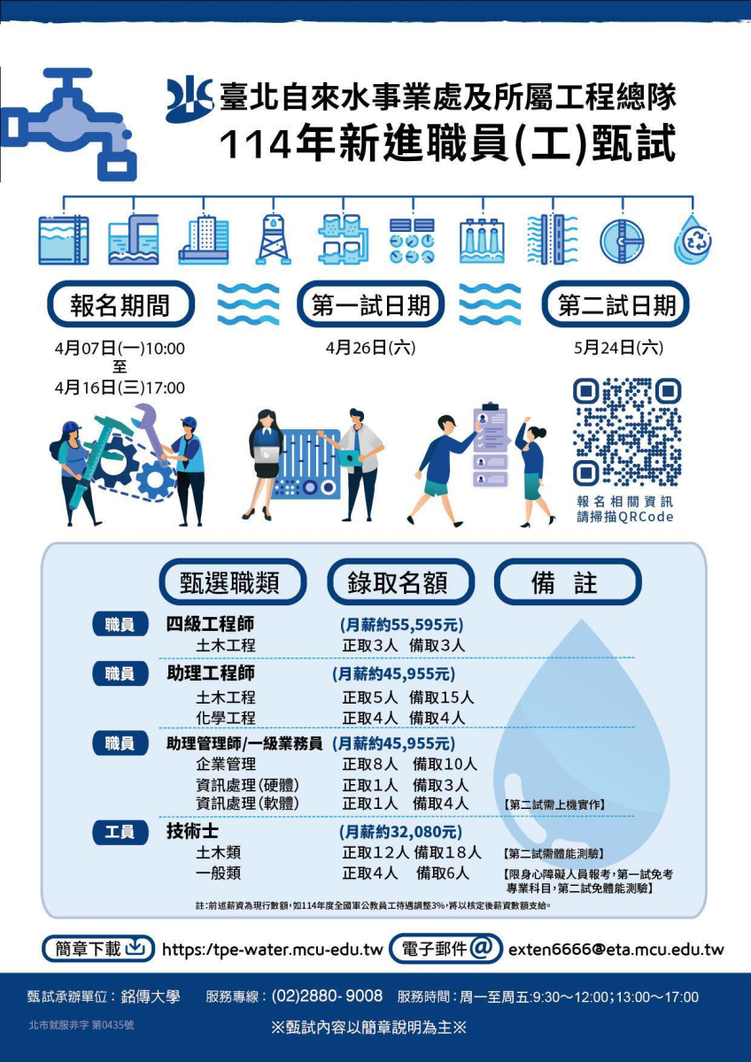 一、旨揭報名時間自114年4月07日(星期一)10:00至4月16日(星期三)17:00止,簡章下載及報名網址: https://tpe-water.mcu-edu.tw。