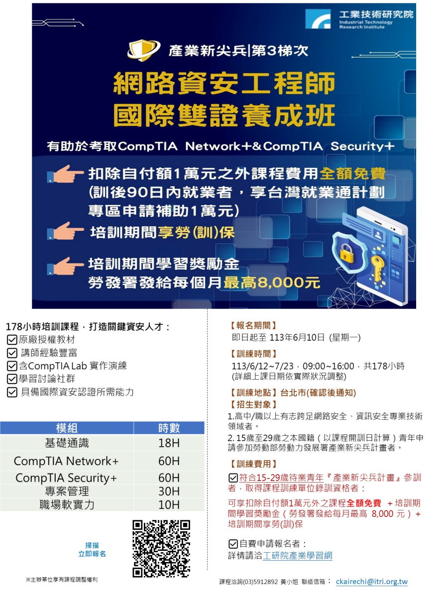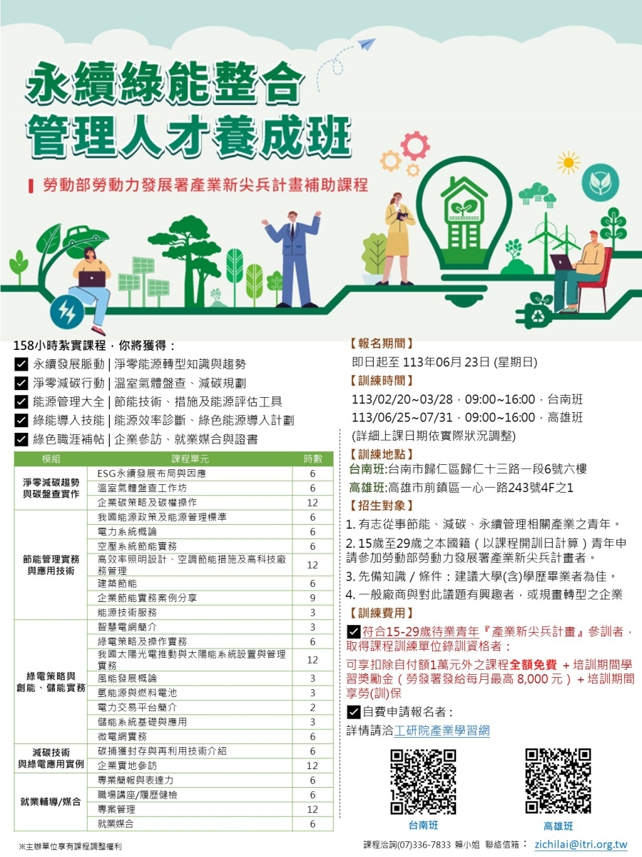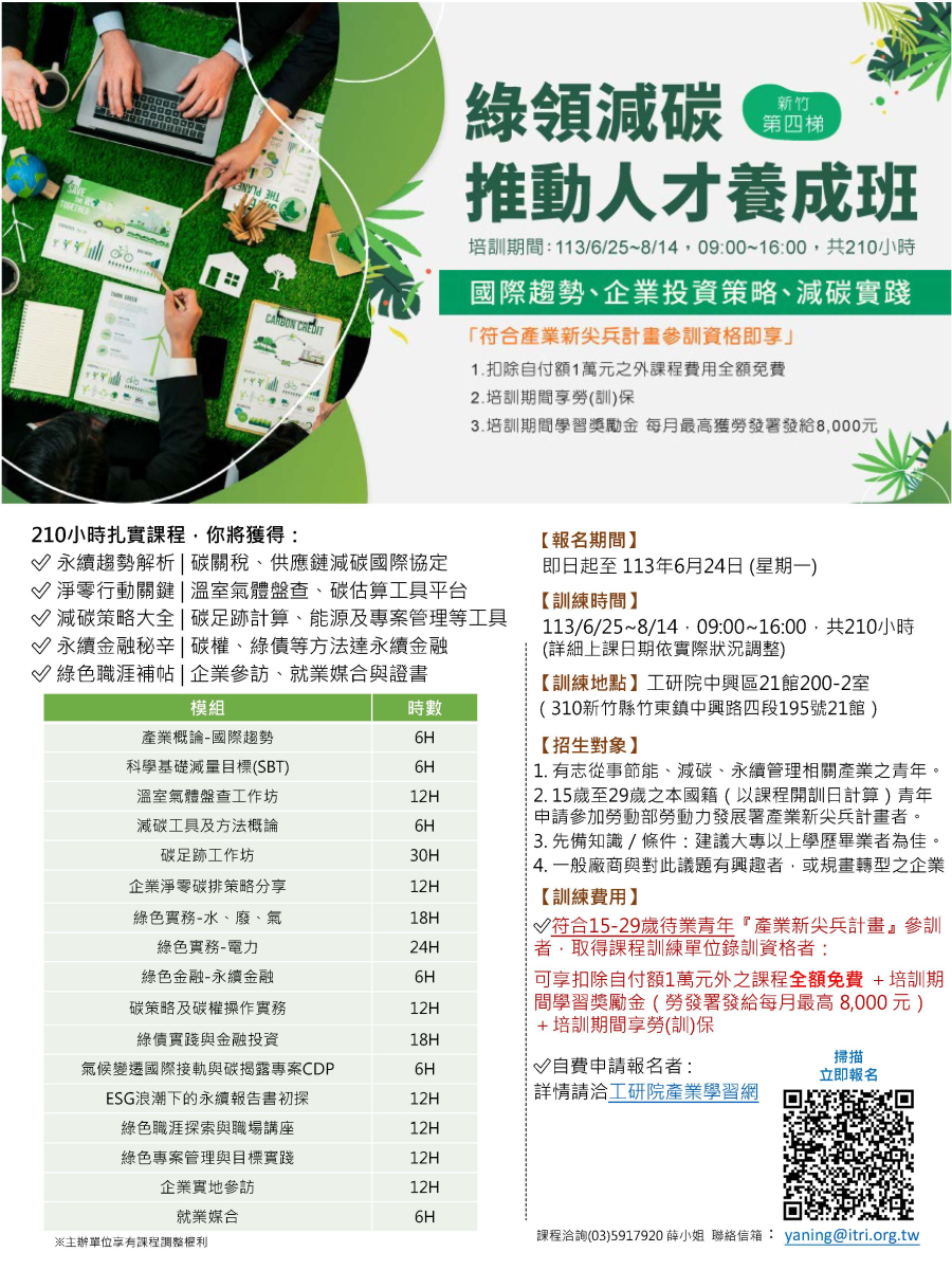 四、檢附各課程簡章及報名網址連結如下,或至「工研院產業學習網」報名。敬請惠予公告並鼓勵貴校師生、校友及家屬等符合資格者報名參加。 (一)2024/06/12~07/23「網路資安工程師國際雙證養成班 (第3梯次)」:https://pse.is/5xbhay;地點:台北。 (二)2024/06/25~08/14「綠領減碳推動人才養成班(第四梯)」:https://pse.is/5kdk5t;地點:新竹。 (三)2024/06/25~07/31「永續綠能整合管理人才養成班」:https://pse.is/5wxfgd;地點:高雄。