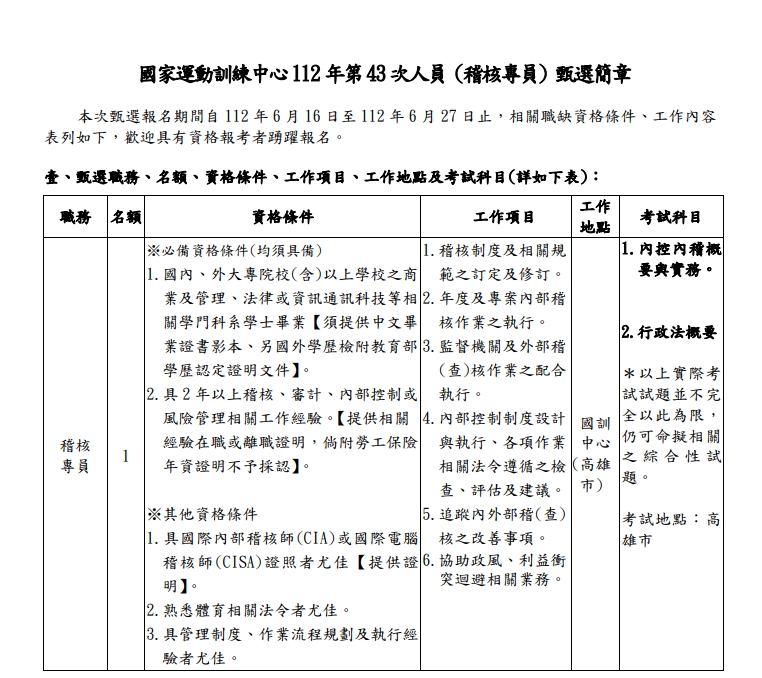 國家運動訓練中心112年第43次人員 (稽核專員) 甄選簡章
