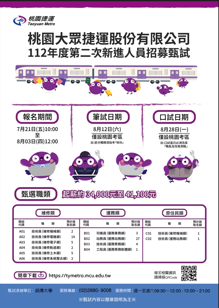 二、本次招考維修類32位、運務類35位、原住民2位,共計69位。並將於112年8月12日在銘傳大學桃園校區舉行術科及筆試,8月28日口試,預計8月31日公告錄取名單,10月起陸續聘用。本次招募的新進人員起薪34,100~41,100元不等,視工作性質及職等類別而有異。