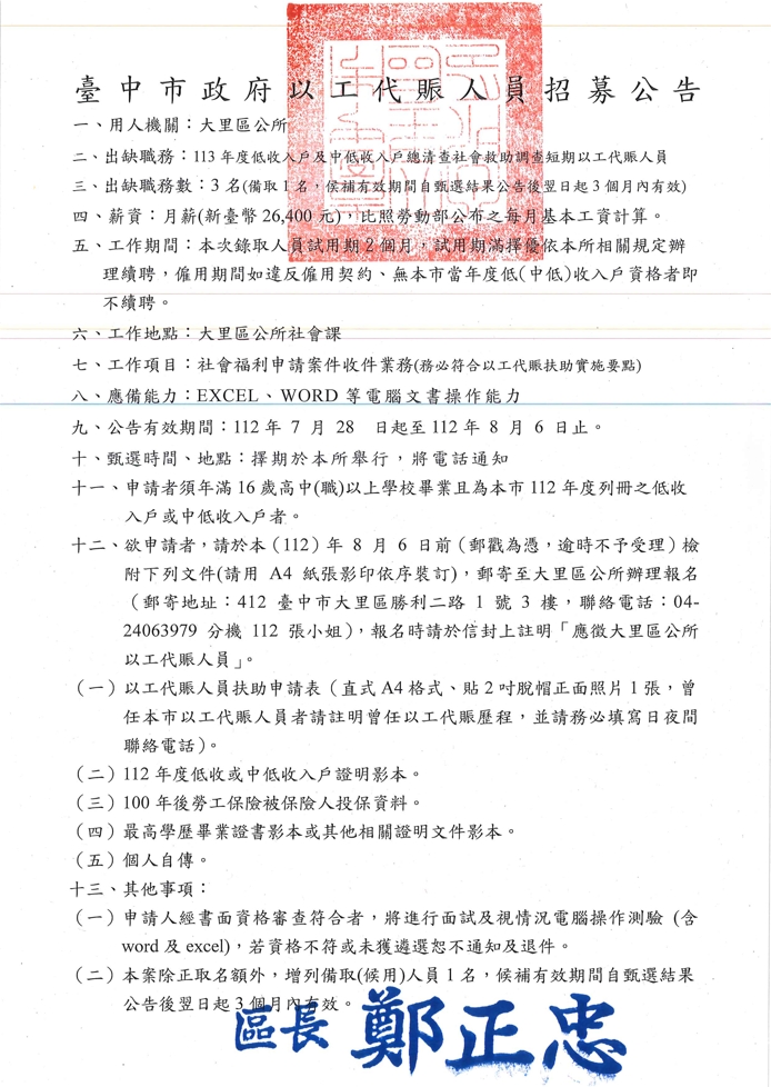 臺中市大里區公所-113年度低(中低)收入戶總清查社會救助調查短期以工代賑人員徵才公告及申請表