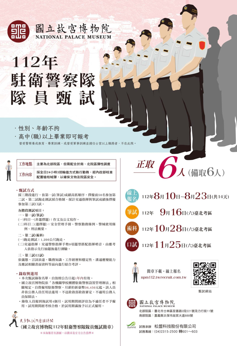 一、簡章取得方式:即日起於甄試網站(https://npm112.twrecruit.com.tw/news/?c=news&id=1)公告,電子檔免費下載,不另販售紙本簡章。