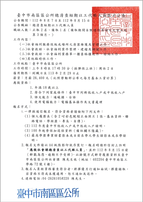 臺中市南區區公所-112年度臺中市低收入戶及中低收入戶社會救助調查短期以工代賑人員徵才公告