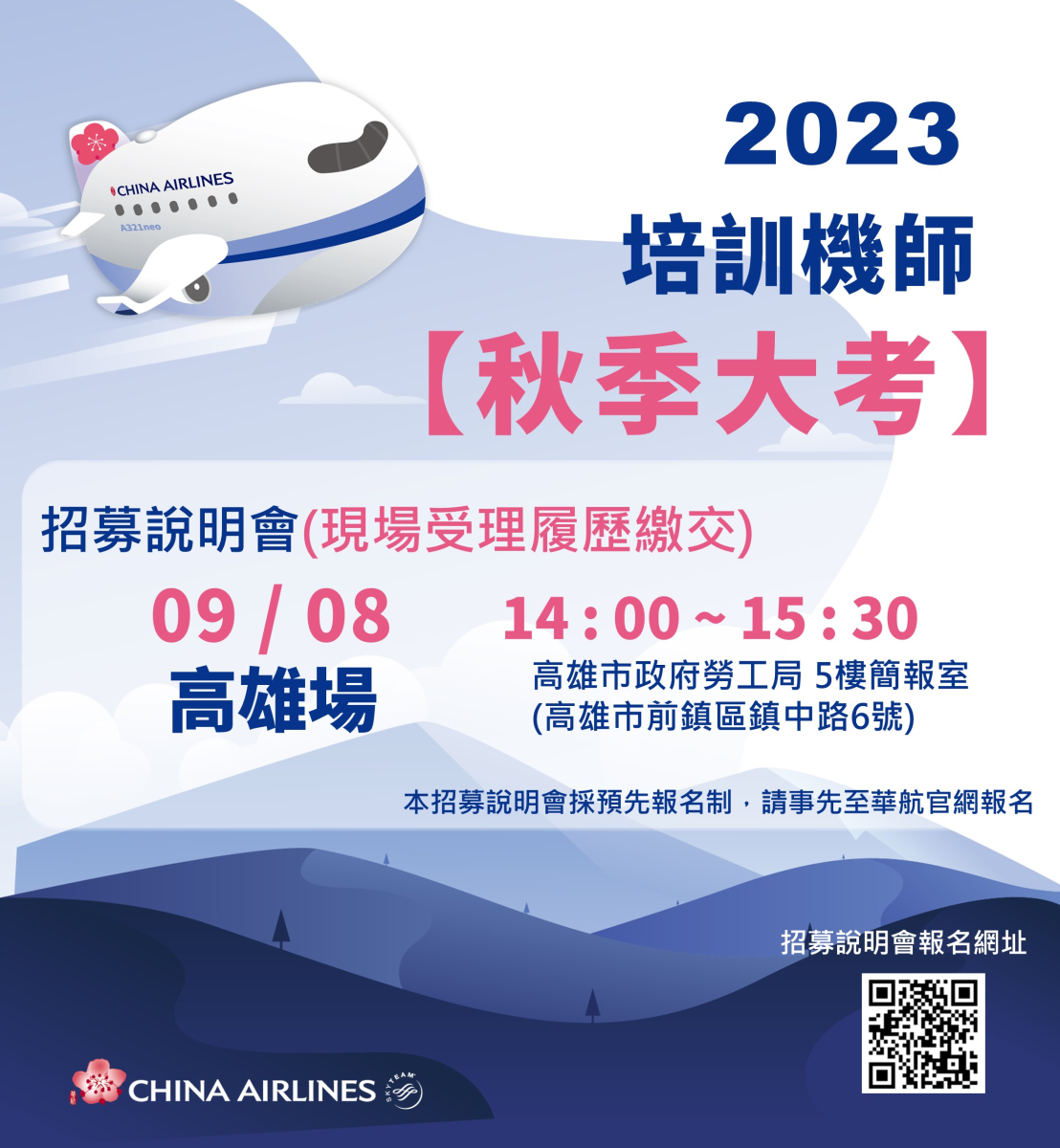 為協助本市民眾在地就業及畢業生返鄉就業,本中心訂於112年9月8日(五)14:00-15:30在高雄市政府勞工局五樓(前鎮區鎮中路6號)辦理旨揭招募說明會,協助中華航空公司招募具英文專業能力之機師儲備人才。