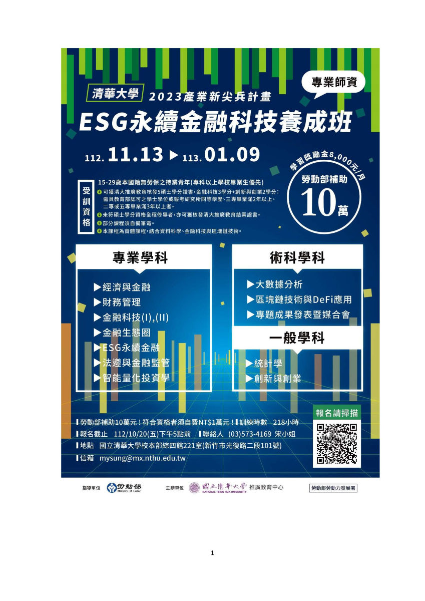 一、旨揭課程建立學員財務投資課程的基礎概念,並藉由區塊鏈技術、大數據分析等程式設計相關的課程,提升學員對於金融與科技跨領域的能力,並結合ESG永續金融概念,期盼學員未來能具備有在金融科技產業之專業能力。