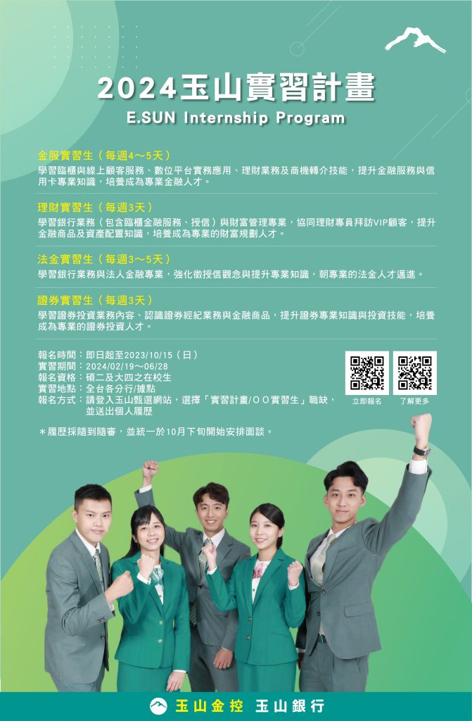 報名方式:請登入玉山甄選網站,選擇「實習計畫/OO實習生」職缺,並送出個人履歷