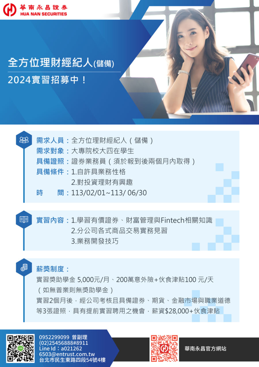 ※實習2個月後,經公司考核且具備證券、期貨、金融市場與職業道德等3張證照,具有提前實習聘用之機會,薪資$28,000+伙食津貼