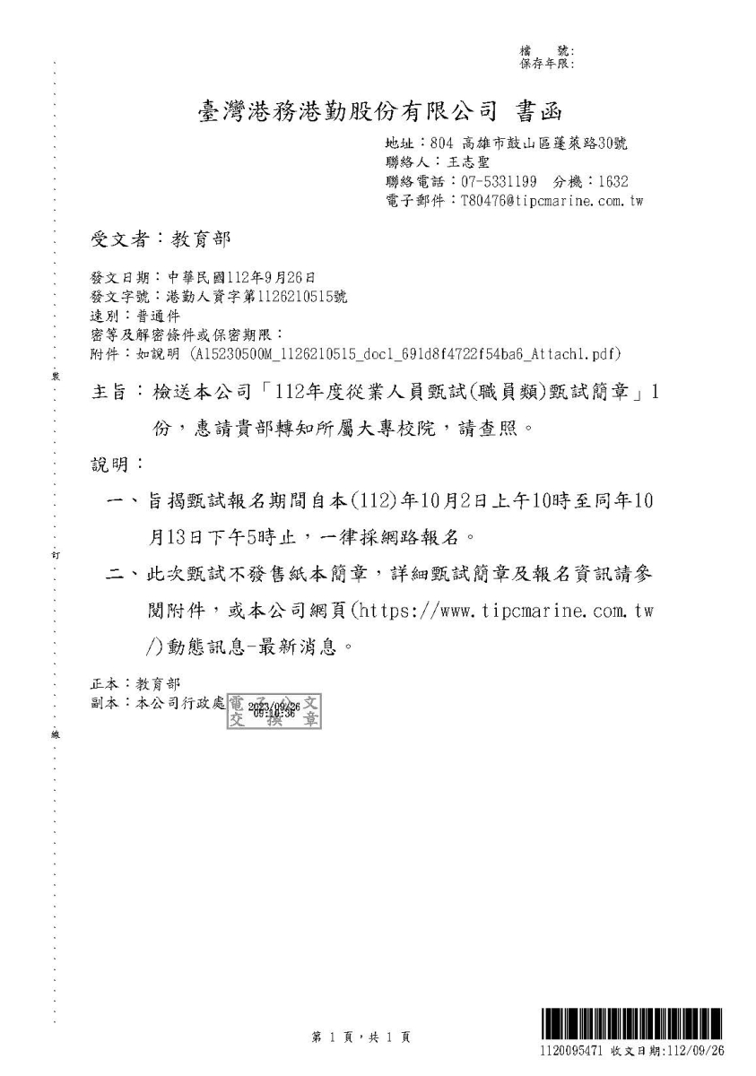東海大學 教務處 Office of Academic Affairs-Tunghai University---臺灣港務港勤股份有限公司「112年度從業人員甄試(職員類)甄試簡章