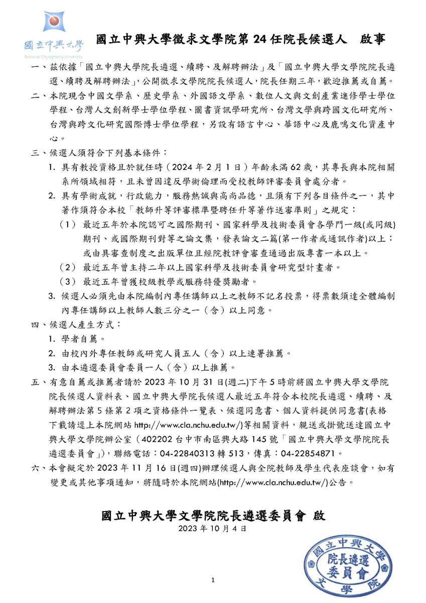 東海大學 教務處 Office of Academic Affairs-Tunghai University---中興大學文學院第24任院長候選人徵求啟事