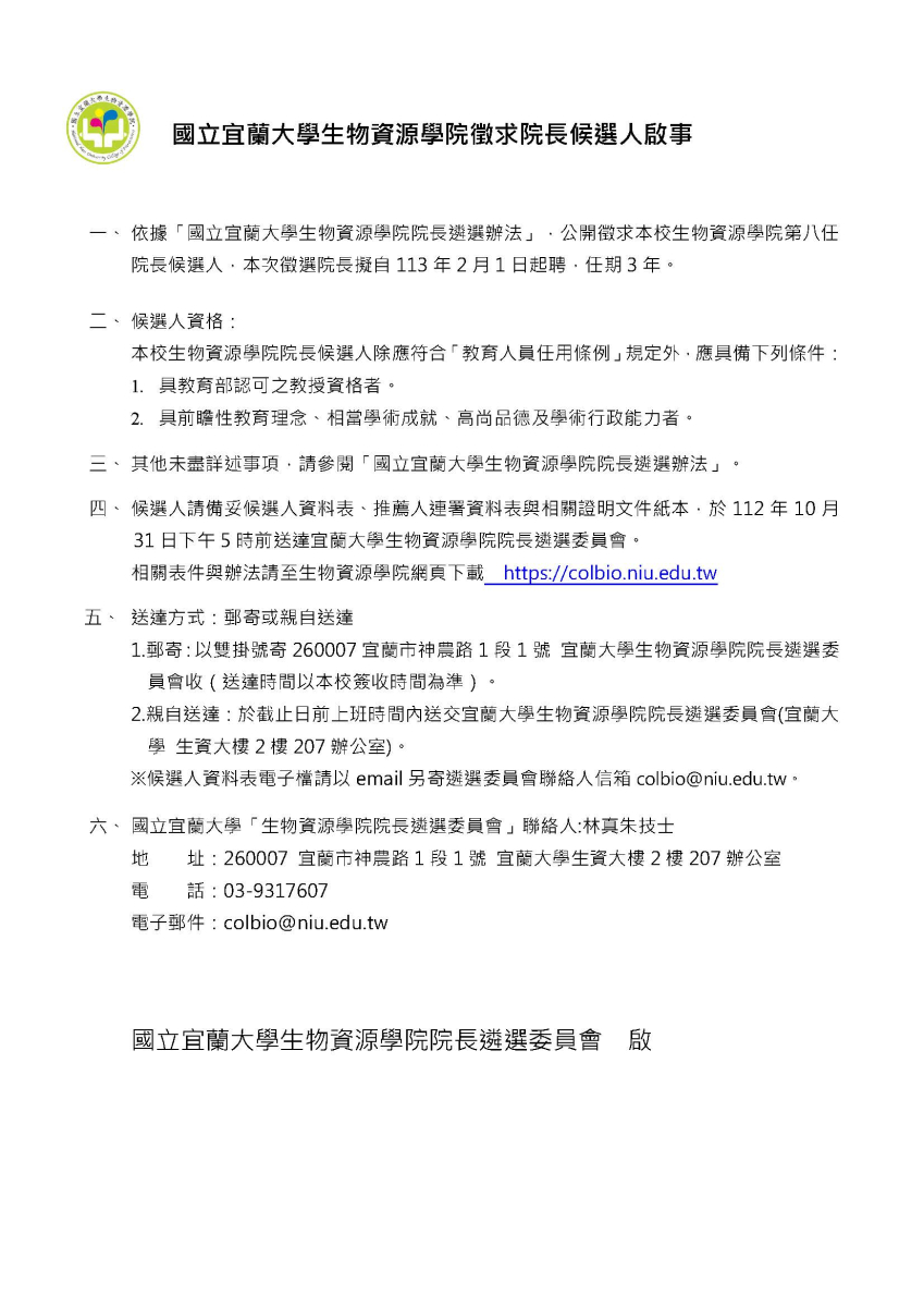 國立宜蘭大學-生物資源學院公開徵求院長候選人