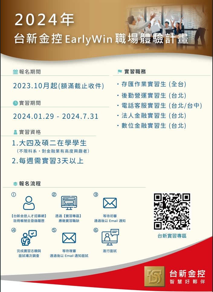 若同學有興趣投入實習計畫,請由【台新人才招募網】註冊帳號、登錄履歷,並透過【實習專區】應徵實習職缺!