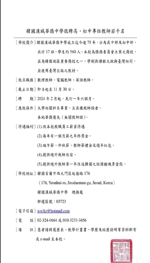 韓國首爾漢城華僑中學初中及高中教師徵才公告