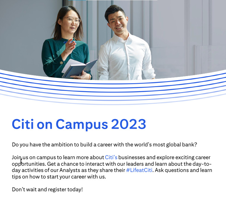 花旗銀行暑期實習計畫徵才活動及申請細節,請參閱花旗銀行全球招募網站https://careers.citigroup.com/students-and-graduates。職缺申請開放至2023年11月19日截止,履歷將採隨到隨審,敬請盡快投遞完成申請。