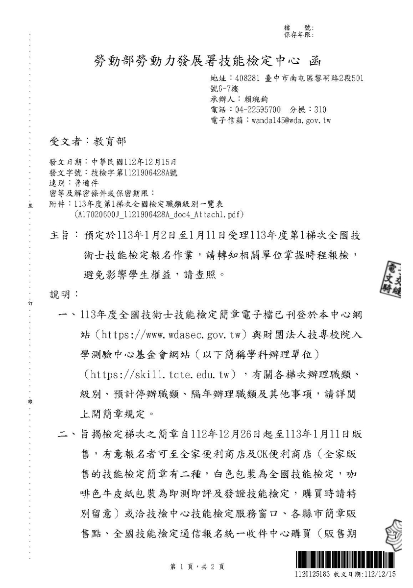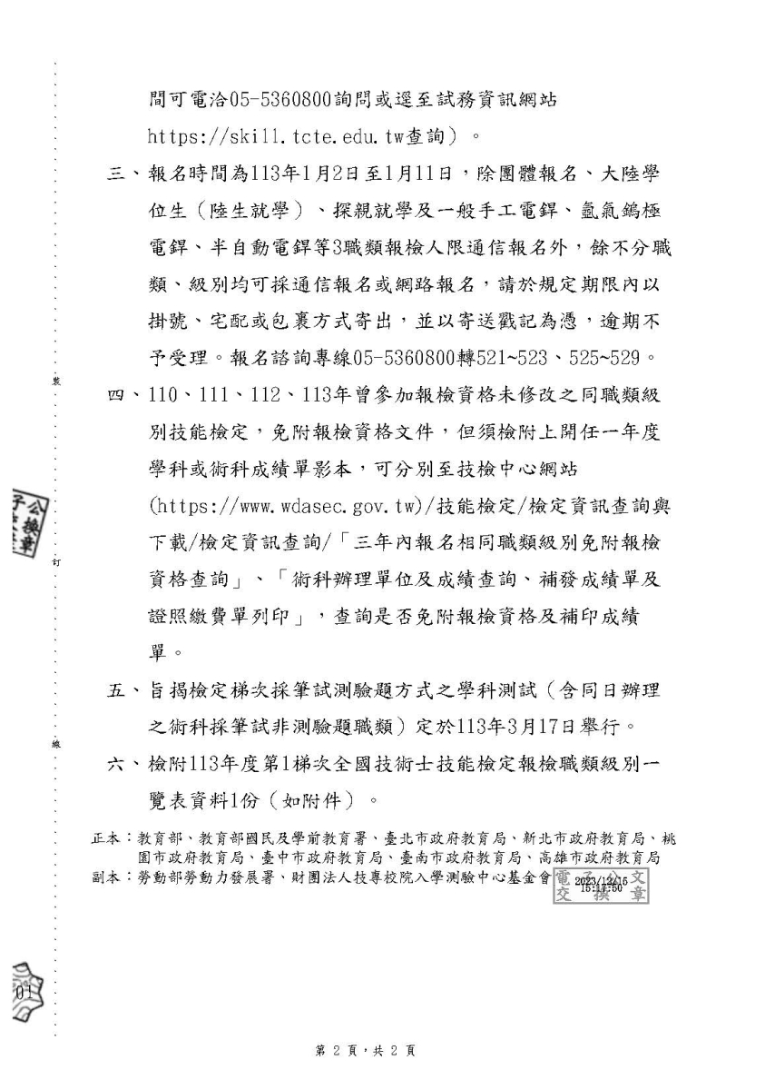 勞動部技能檢定中心113年1月2日至1月11日受理113年度第1梯次全國技 術士技能檢定報名作業
