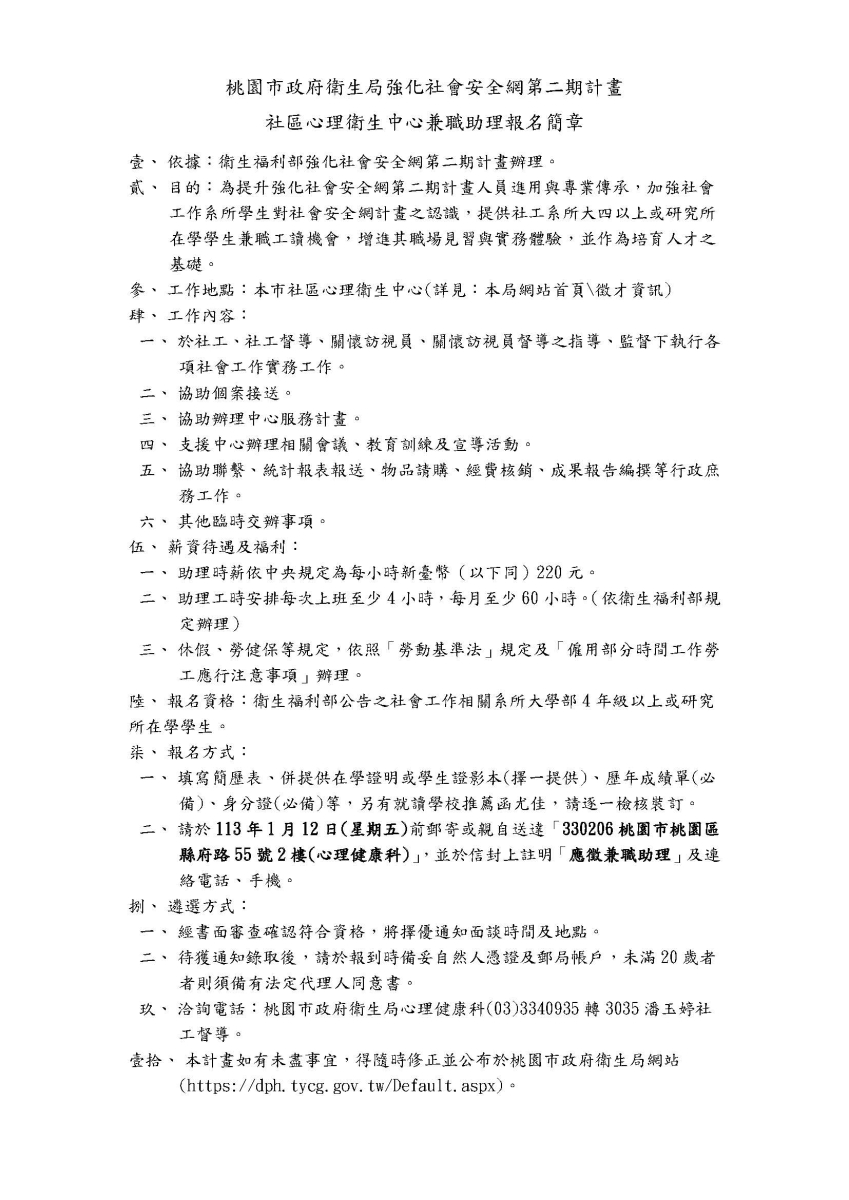 三、本案助理職缺3名,自即日起至113年1月12日下午5時止受理投件,相關資訊請至本局網站徵才資訊(網址:https://dph.tycg.gov.tw/News.aspx?n=4221&sms=10123)查閱,如有疑問請洽潘玉婷社工督導03-3340935分機3035。