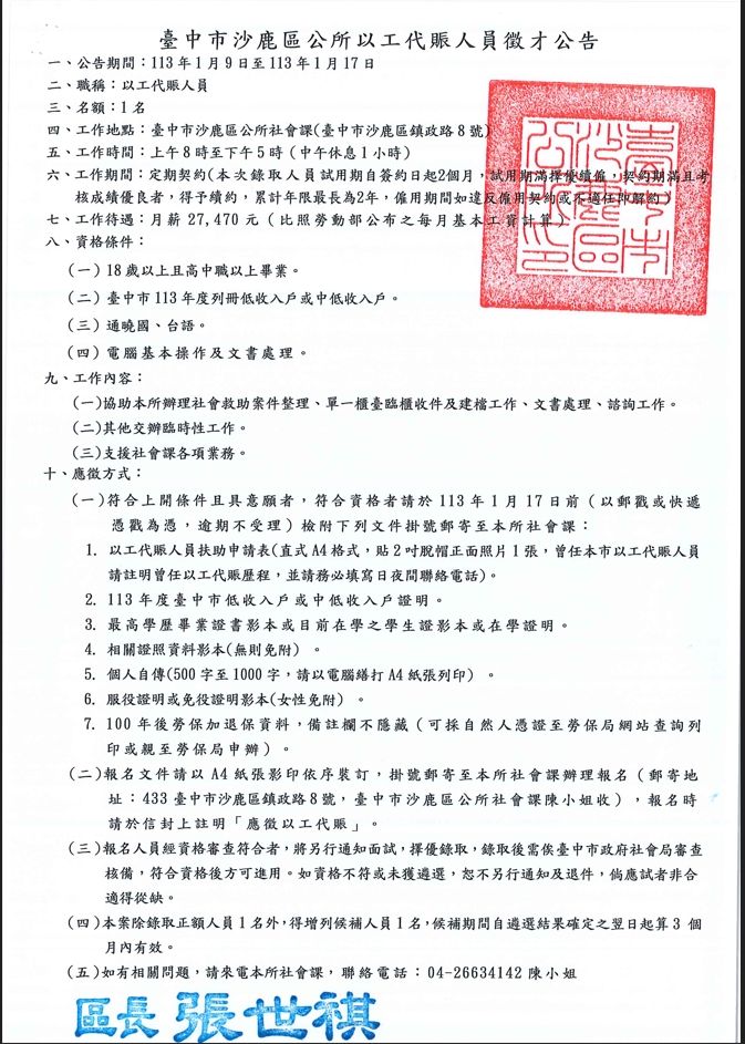 臺中市沙鹿區公所-社會課以工代賑人員徵才公告