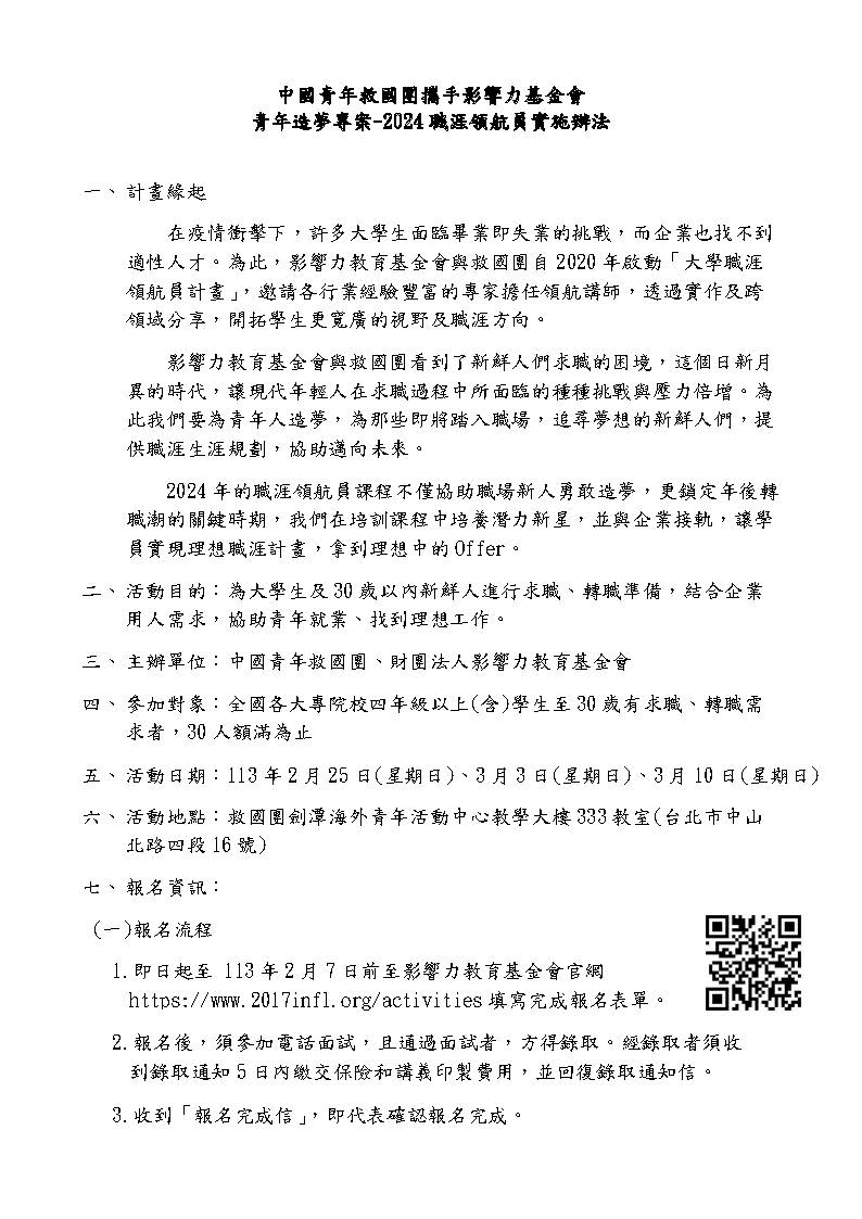 二、活動對象:全國各大專院校四年級(含)以上在學學生至30歲以下有求職需求者,30人額滿為止。