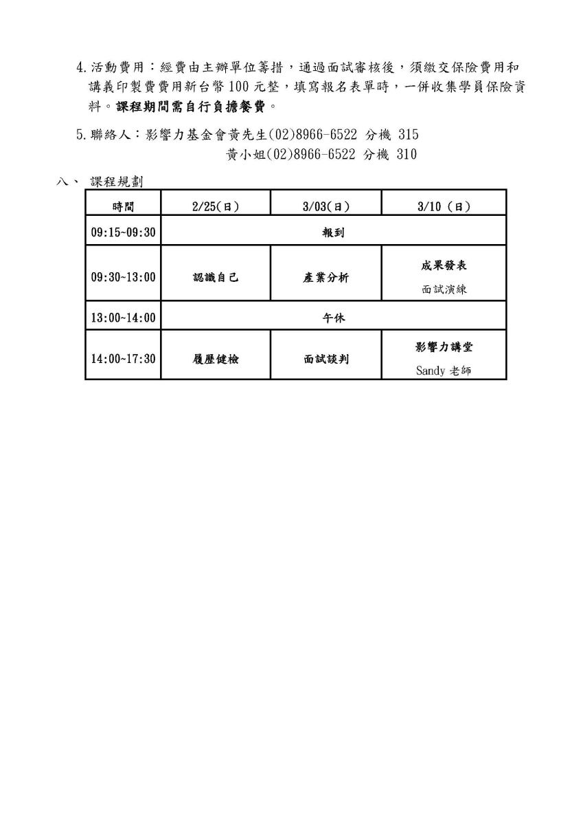 (三)聯絡人:影響力基金會黃先生(02)8966-6522 分機 315 黃小姐(02)8966-6522 分機 310