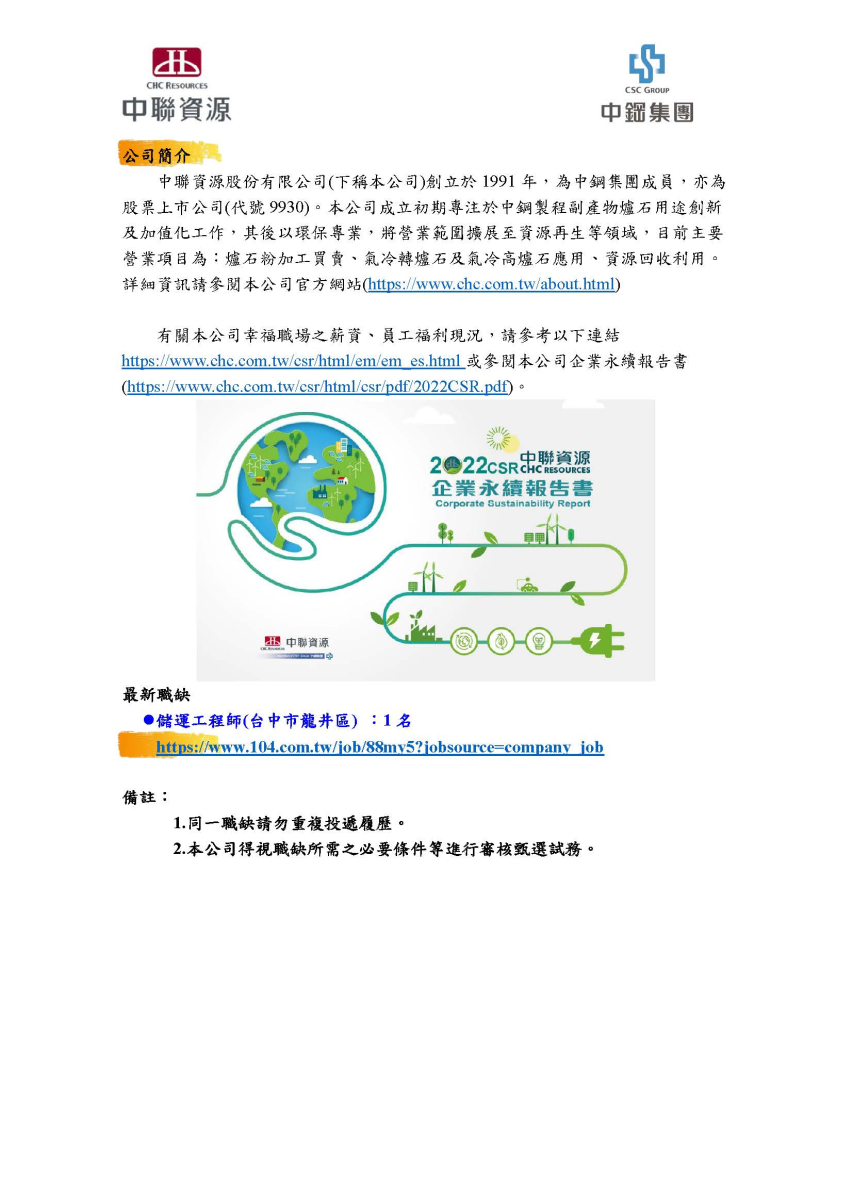 一、本公司為中鋼集團成員,股票於1999年掛牌上市,公司獲利穩定,薪資福利佳,貴校畢業校友於業界表現優異。近期招募職缺詳如,敬請貴校就業輔導單位協助公告。