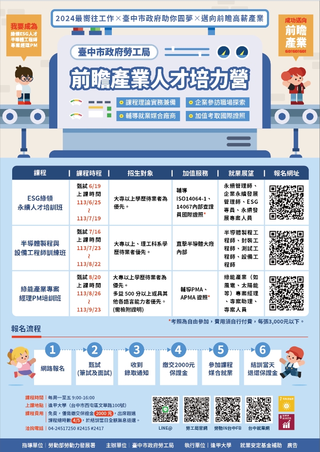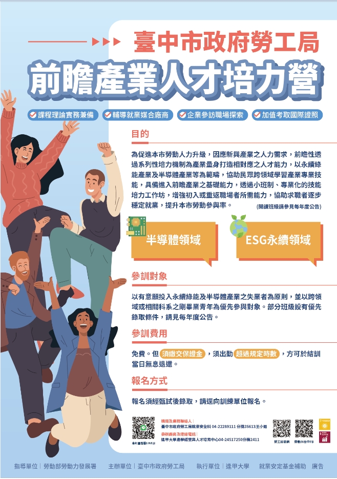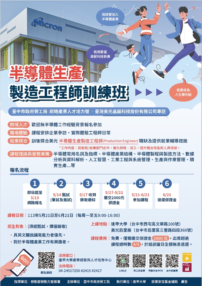二、為協助青年跨領域學習產業專業技能,具備進入前瞻產業之基礎能力,本局辦理「半導體生產製造工程師訓練班(美光專班)」、「半導體製程與設備工程師訓練班」、「ESG綠領永續人才培訓班」及「綠能產業專案經理PM培訓班」共計4班次,每班108-132小時,供中部地區有意願投入永續綠能及半導體產業之失業者為原則,並以跨領域或相關科系之應屆畢業青年為優先參與對象。