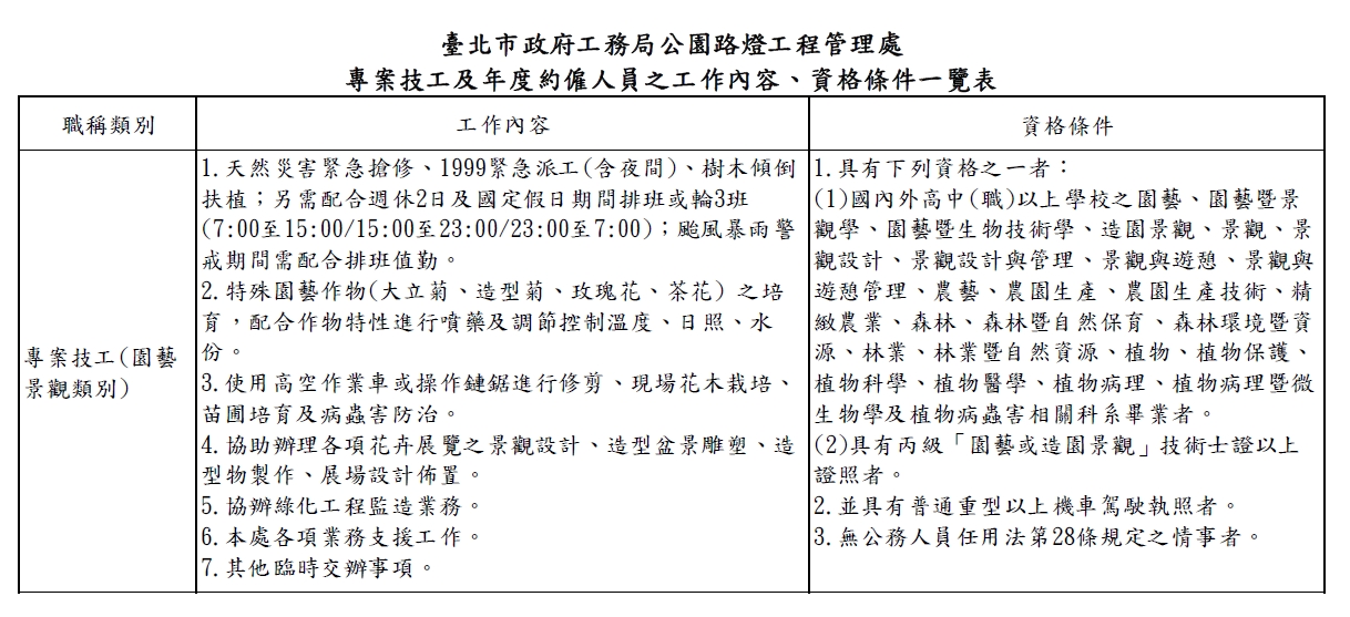 一、依據臺北市政府各機關約聘僱人員暨專案技工、工友公開甄選作業程序辦理。