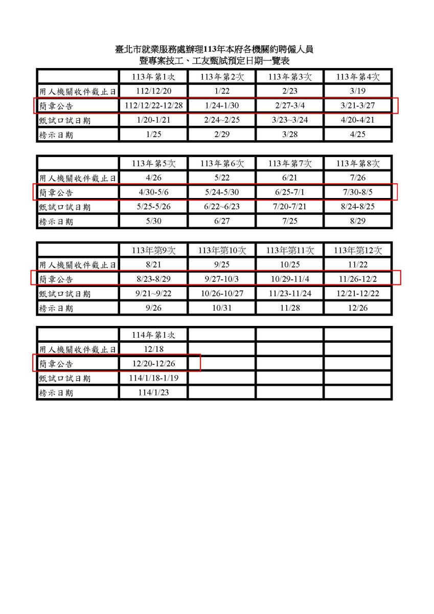 二、臺北市就業服務處每月辦理一次甄選作業,甄試方式以口試為原則,甄選簡章於公告期間刊登於臺北市就業服務處網站,報名截止時間簡章即下架。