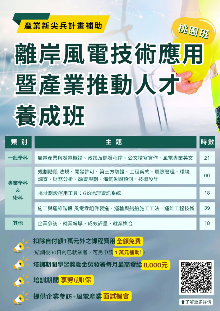 一、因應淨零轉型帶來的工作技能轉變及配合我國風力發電政策推動趨勢,再生能源職涯關鍵技術能力與人才職能需求增加,本院擬於113年12月2日至114年1月22日辦理「離岸風電技術應用暨產業推動人才養成班」,培訓待業青年,提升職場就業機會與競爭力。