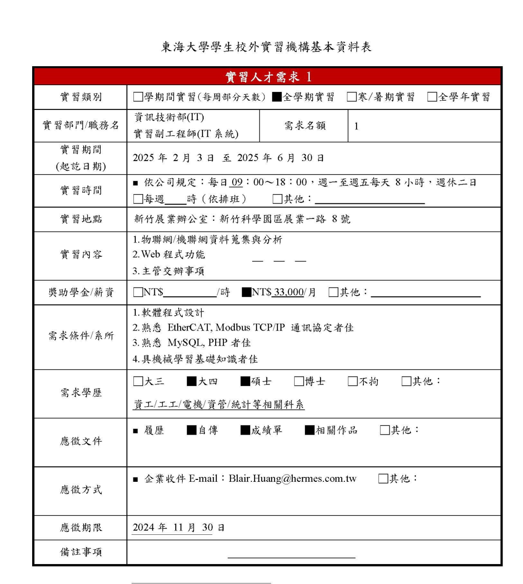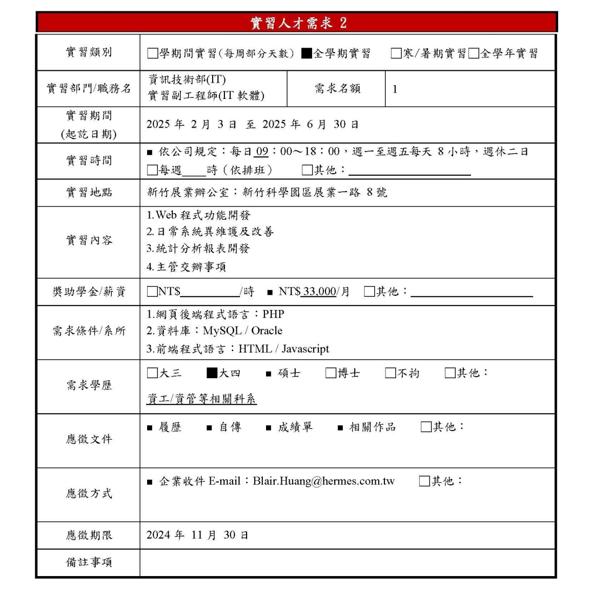 *實習履歷不限格式,需於履歷註明應試職缺,請於11/30前寄送至Blair.Huang@hermes.com.tw,