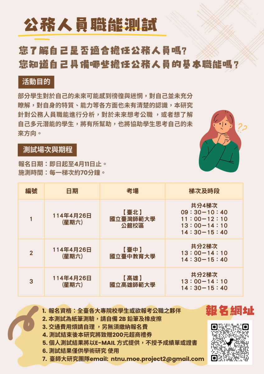 ※ 測試日期及時間:本測試為紙筆測驗,將於114年4月26日(星期六)分地區分梯次舉行,每梯次約70分鐘(詳附件海報)。