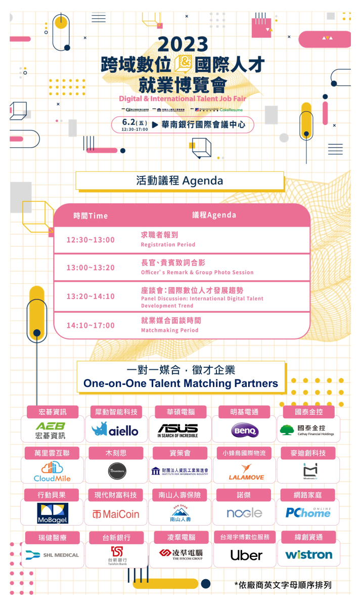 一、本活動謹訂於2023年6月2日(五)12:30~17:00,假華南銀行國際會議中心(地址:台北市信義區松仁路123號2樓)舉行,敬邀貴校應屆畢業生、外籍生,及有求職、轉職需求的校友踴躍參加,報名網址:https://ievents.iii.org.tw/EventS.aspx?t=0&id=2066。