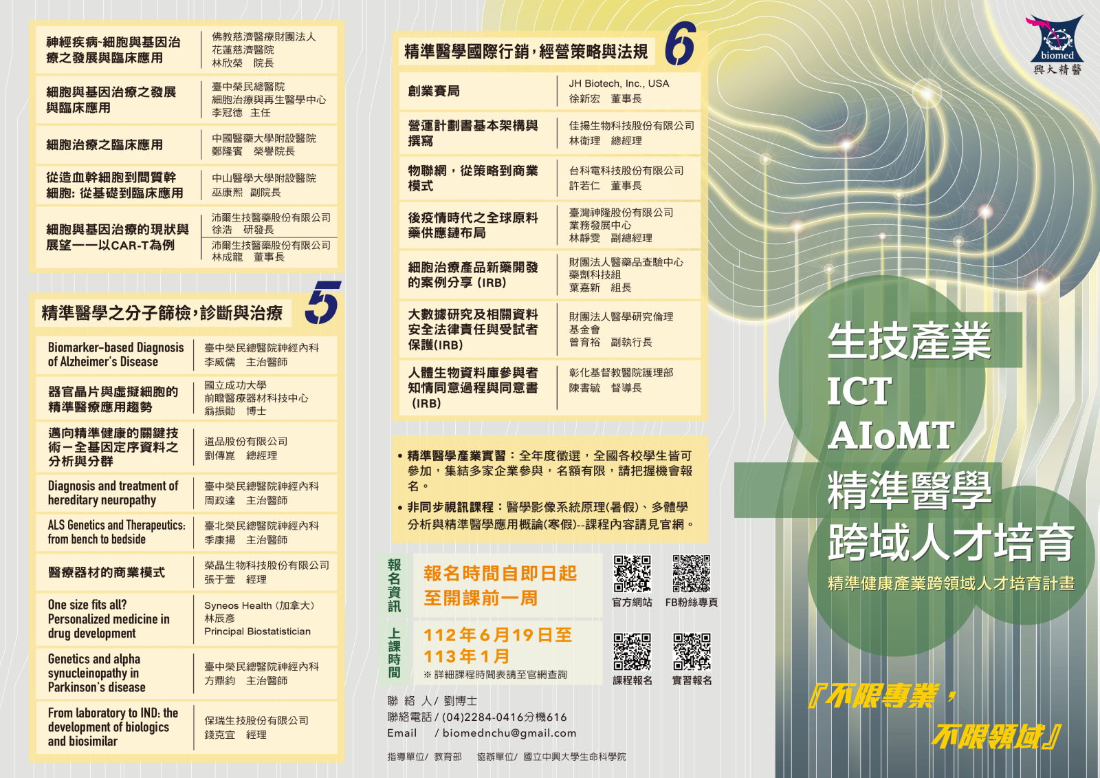 (三)上課時間:112年6月19日至112年8月11日,詳細課程資訊請見:http://biomednchu.nchu.edu.tw/class。