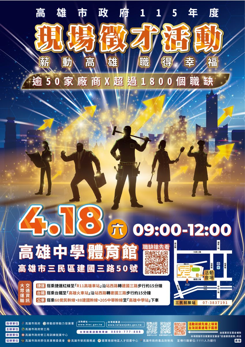 一、為協助本市民眾就業,本中心訂於115年4月18日(星期六)上午9時至12時於高雄中學體育館(高雄市三民區建國三路50號)辦理「薪動高雄 職得幸福」大型現場徵才活動,共計邀請50家廠商,提供逾1,800個職缺。 二、如對活動有任何疑問,請洽本案承辦人吳小姐,聯絡電話:(07)3837191分機39。