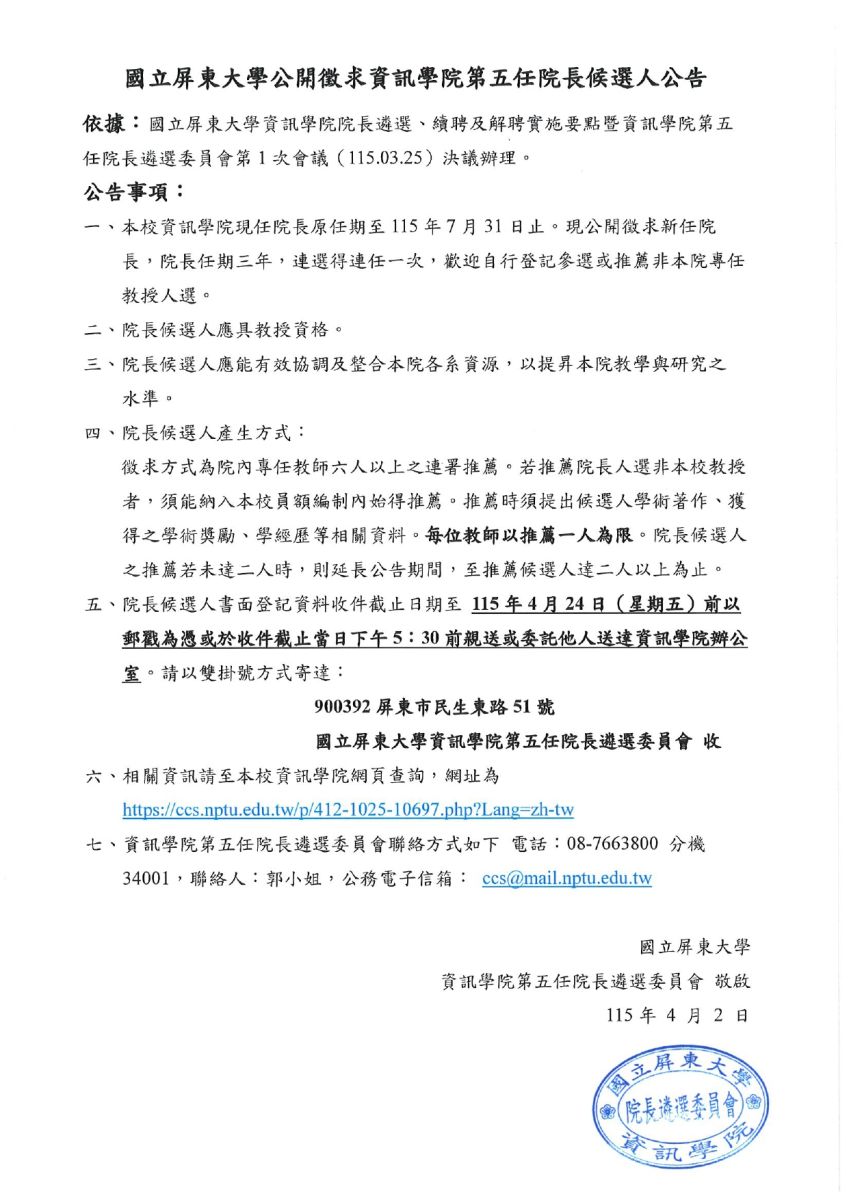 一、本校資訊學院公開徵求第五任院長候選人,請於115年4月24日(星期五)前,將書面登記資料正本寄至「國立屏東大學資訊學院第五任院長遴選委員會」(以郵戳為憑或於收件截止當日下午5:30前親送或委託他人送達資訊學院辦公室)。