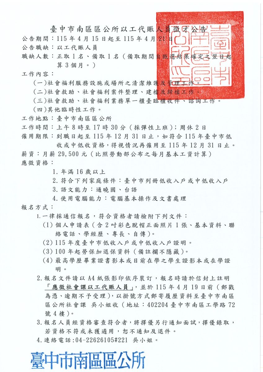 檢送本所115年度臺中市低收入戶及中低收入戶社會救助調查以工代賑人員徵才公告及申請資料表