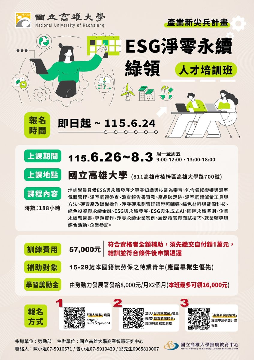 (三)「ESG淨零永續綠領人才培訓班」:訓練期間:115年6月26日至115年8月3日。